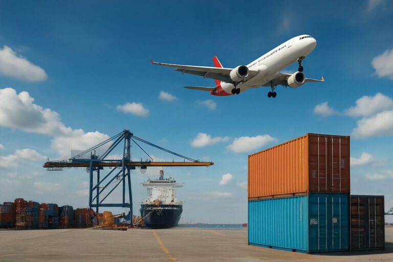 Kombinierter Transport per Schiff, Zug, Lkw und Flugzeug.